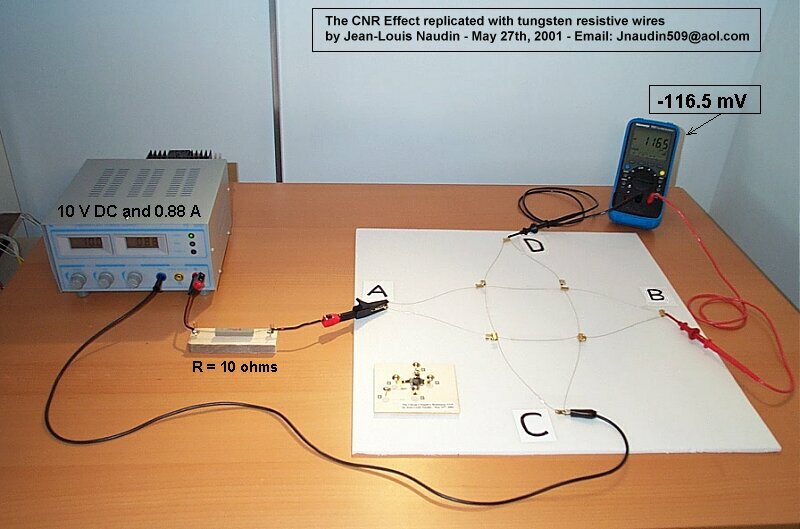 When the apparatus is connected at the points A-C to a 10 V DC power supply through a 10 ohms resistor, the Digital Voltmeter ( Tektronix TX1-DMM ) shows a NEGATIVE voltage ( -116.5 mV ) across the points B-D as the previous CNR v2.0 experiment.