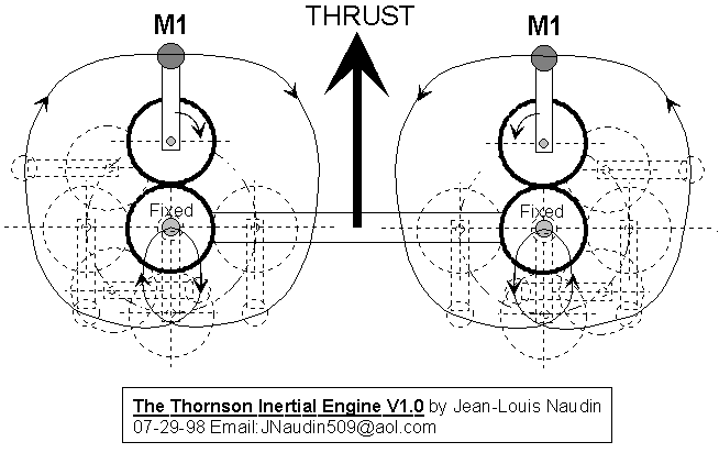 Additional notes : "In 1990, a 16 foot Grumman canoe and two passengers with a gross weight of 450 pounds demonstrated a low acceleration rate and propulsion of one mph after traveling 75 feet in a swimming pool. The 60 pound Thornson prototype was totally sealed inside a plywood case..." ( from Thomas Valone paper "Inertial propulsion: the Thornson EZKL drives" - PACE Newsletter vol 7-1, 7-4 and Vol 9-4 ).