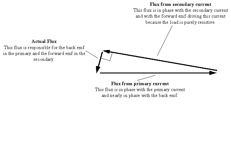 The gif above shows the phasor diagram for a transformer. The fluxes from the primary and secondary currents almost cancel, but not quite. What remains is the actual flux in the core which drives the emf's. The secondary current (and flux vector) is in phase with the induced emf (because the load is resistive). The primary current (and flux vector) is almost in phase with the induced emf, so the primary impedance as seen by the input source is almost resistive: the small phase angle here is the inductive component needed to "create" the actual flux. As you reduce the load resistance you get greater primary and secondary current, so these two flux vectors get bigger (assuming the source can drive the increased power). But you can't do this ad infinitum. The power transfer limit is reached, not by the core's ability to carry the flux (for a given voltage the flux swing is constant, independant of the power transferred), but by the copper losses.