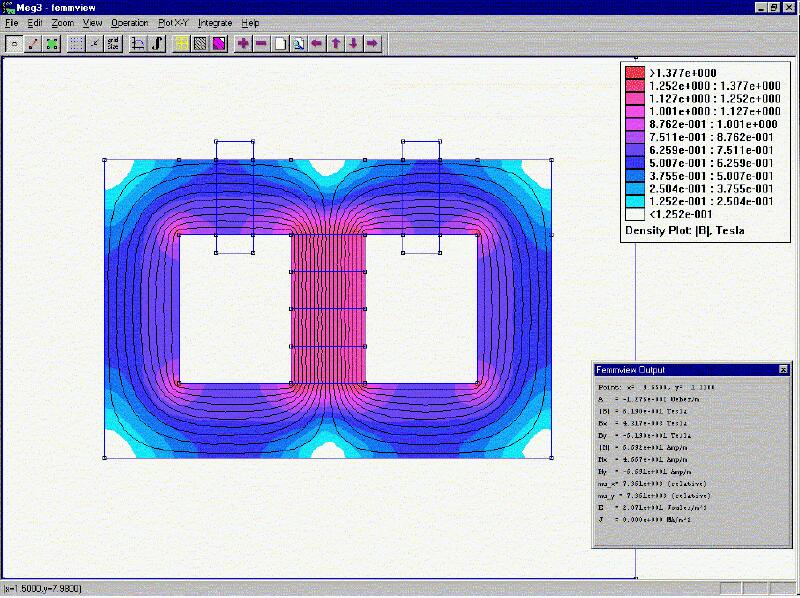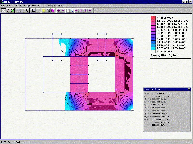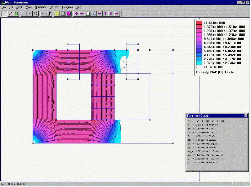 We now place coils on this core. We use two control coils on the top on each side of the magnet stack. And we wind two output coils on each vertical leg on opposite sides. The output coils are not shown on the FEMM simulation pictures.