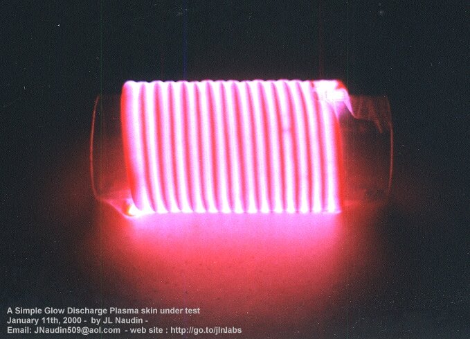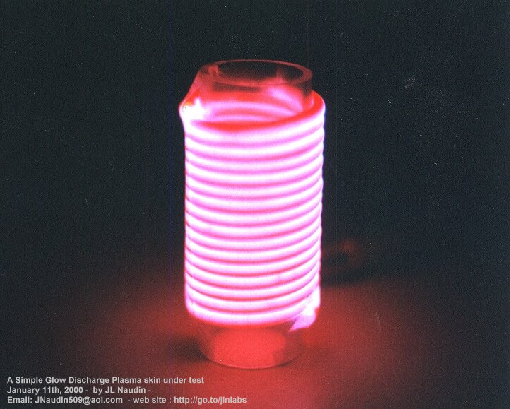 You will find below a very simple OAUGDP ( One Atmosphere Uniform Glow Discharge Plasma ) in action. A glow discharge plasma skin covers the entire surface of the cylinder while a High Voltage at High Frequency is sent...