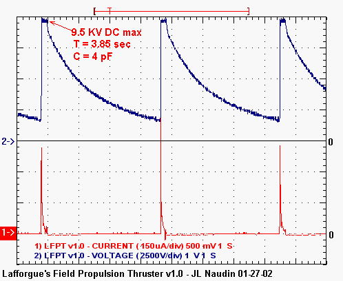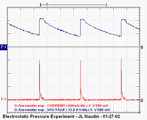The Aerometer ( Hydrometer ) motion due to the electrostatic pressure follows the voltage curve and does'nt consume current. The similarity of the LFPT and the Electrostatic Pressure experiment seems to confirm that the origin of the phenomenon is similar.