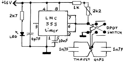 These two capacitors are excited in opposite polarity by a small 555 oscillator, producing a waveform with an exponential rise and a ramp fall part. This waveform has a net derivative of current different than zero per cycle. A force is thus produced on each capacitor. As the two capacitors are driven in anti-phase, they produce a torque which revolves the whole apparatus by a readily observable angle. The direction of rotation can be reversed by reversing the polarity of the waveform applied to the capacitors, To do so, an inverting DPDT switch is incorporated in the circuit.