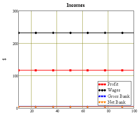 [13] The parameters were an initial loan of $100, loan rate of interest of 5%, deposit rate of 1%, 3 month lag between financing production and receiving the sales proceeds, 1/3rd of the surplus from production going to firms as profits and the remainder to workers as wages, a one year lag in price adjustments, a money wage of $1, worker productivity of 1.1 units of physical output per worker per year, and a one year lag in spending by bankers and a two week lag by workers.