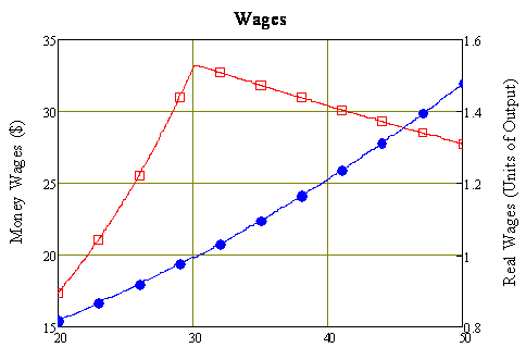 Finally, wages behave in a perverse fashion, just as Keynes argued during the Great Depression: nominal wages fall, but real wages rise because the fall in prices outruns the fall in wages.