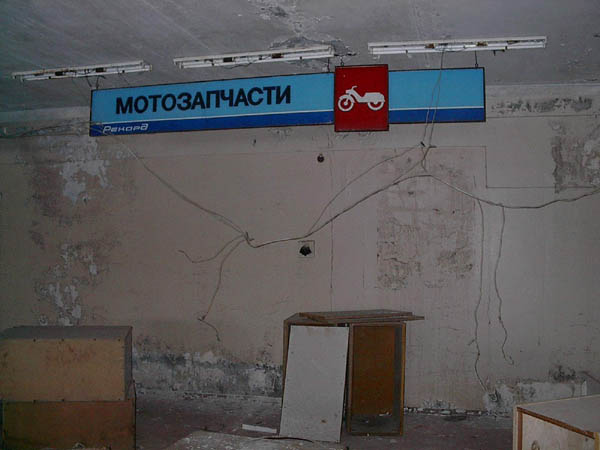 Label tells- motorcycle Chezet, 26hp, 343cc, price 1050 rubles... Chezet! that was a dream bike for all young people in a Soviet Union. Crowd of boys have been hunging around in those stores dreaming of what they could do with 26 hp bike if Grandpas had only 15 ponnies and how can you afford it, if average monthly wage was only 180 rubbles? then alarm, evacuation, panic... no shop assistants no police.. this shop has been emptied out in a matter of hour. Banks survived, even jewelry stores survived through evacuation day, but this shop didn't have a chance. P.S. Police start shooting marauders as only first radiactive tv sets appeared on a second hand market, in Kiev.